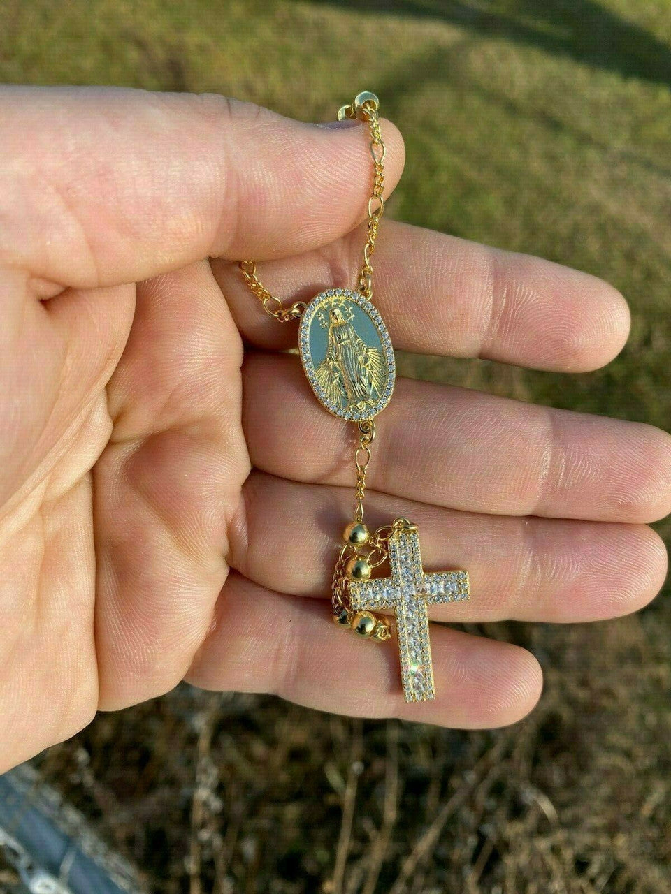 Classic Italian Virgin Mary Rosary Beads Necklace Iced Out CZ Stones - 14k Gold Vermeil 925 Silver - 4mm - 24"