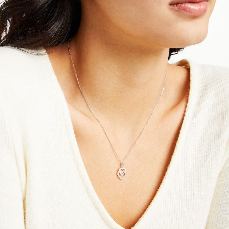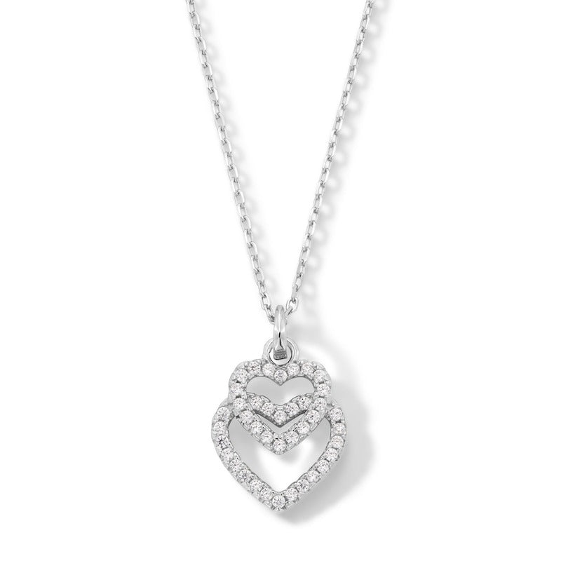 Solid Sterling Silver CZ Graduated Double Heart Outline Drop Pendant - 18"